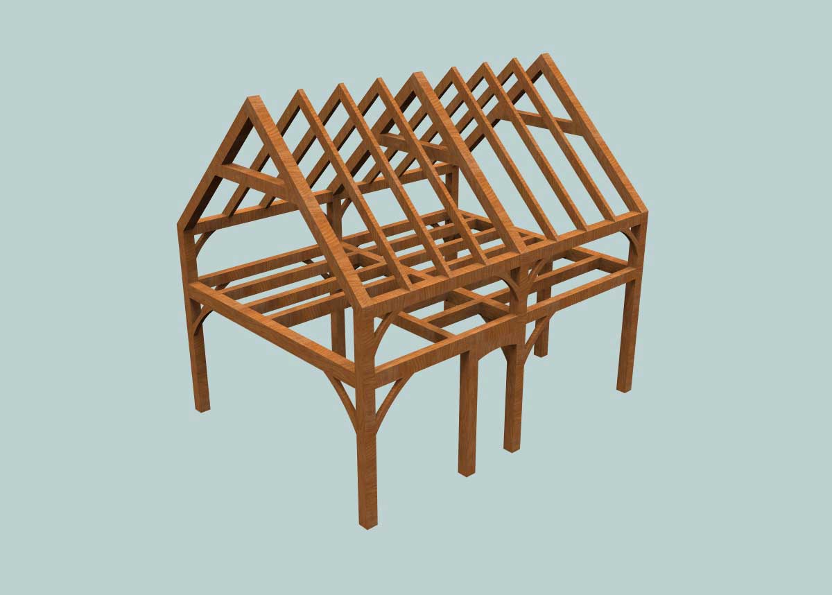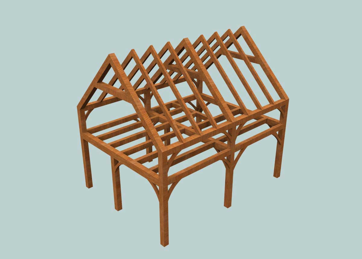 Roof plan (plan view of roof framing), 2nd floor framing, timber elevations, timber bent drawings (sections) and timber sizings.